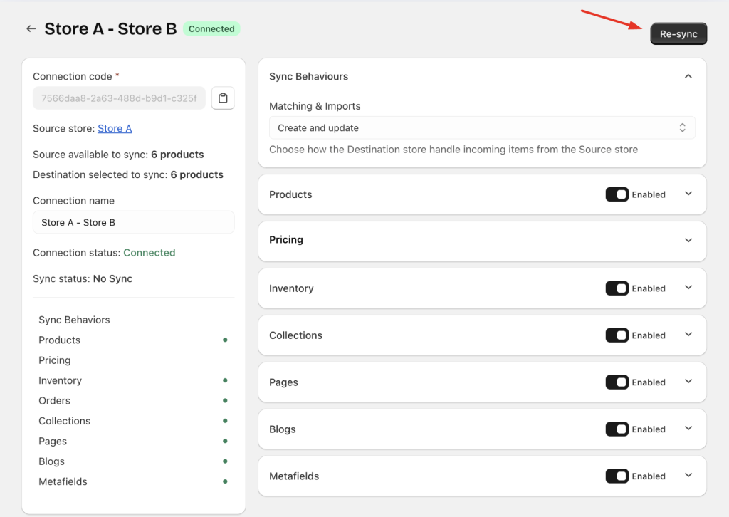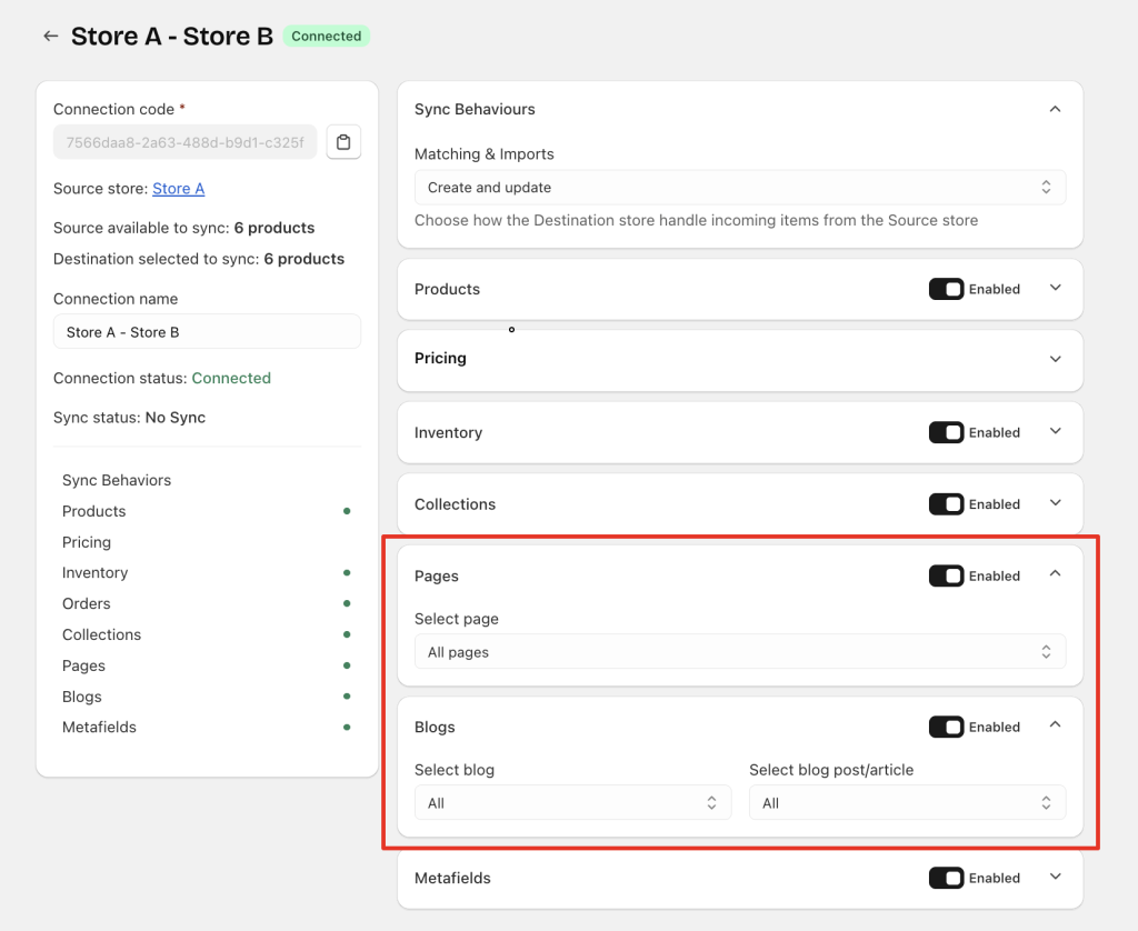 Once you have successfully connected two stores, you can start syncing Pages, Blogs, and Blog posts from the Source store to the Destination store.