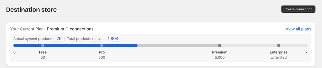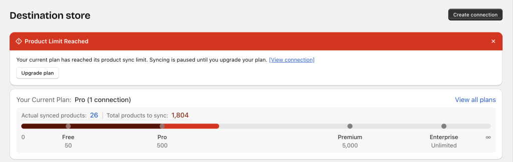 If syncing has already been performed before, but the Destination store updates the sync scope (for example, switching from “specific products” to “all products”) and the new scope exceeds the plan limit, then all syncing will be paused. Nothing will sync again until the Destination store upgrades.