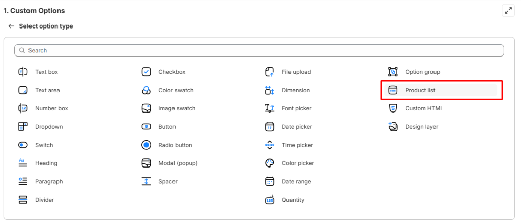 Conditional logic: Determine the visibility of the Product list, ensuring it appears only when specific custom options or Shopify variants are selected. To set up the conditional logic for your Product list, follow this guide.