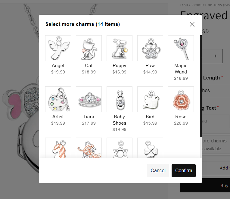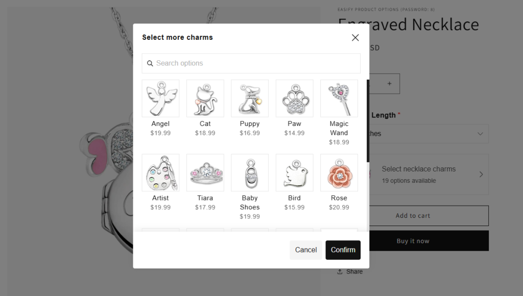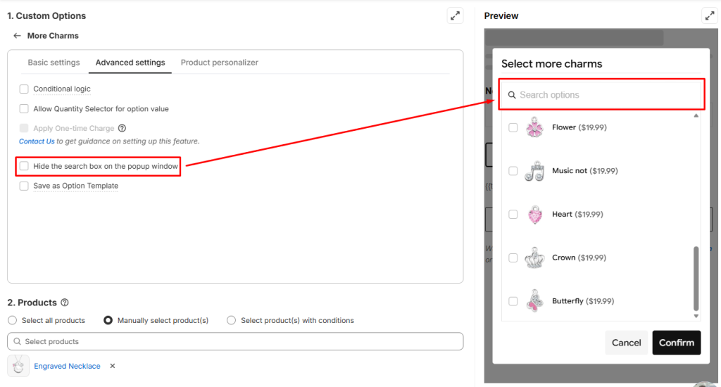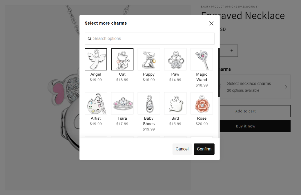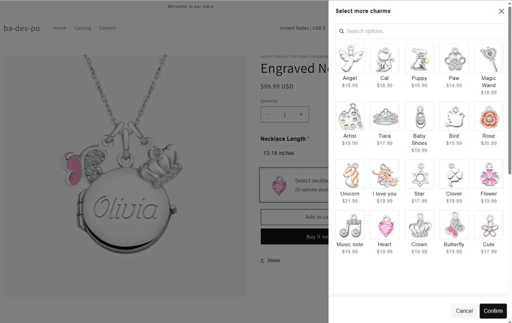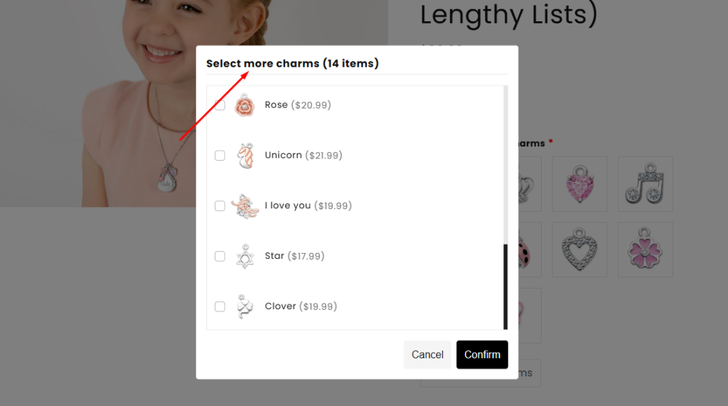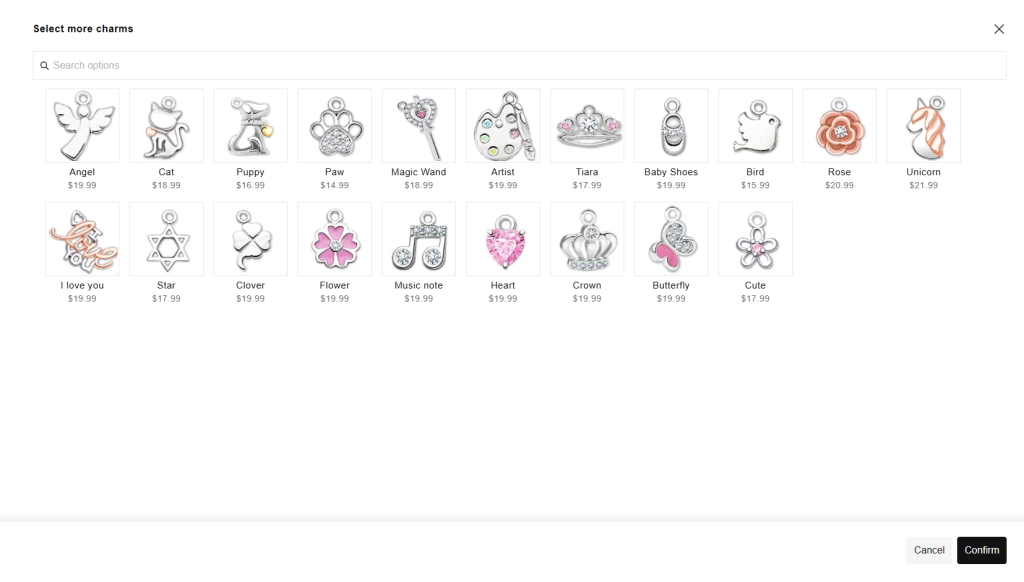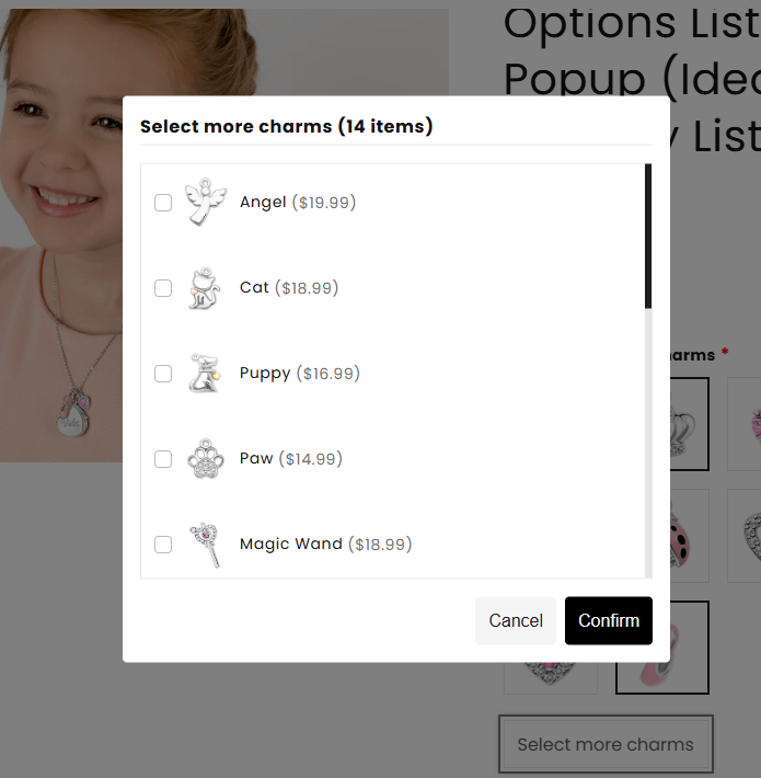Unlike common option types that can make sites look cluttered and lengthy, the Product List presents a single button. When customers click on it, a popup appears, showcasing a list of option values (single or multi-select), which can be your existing products.