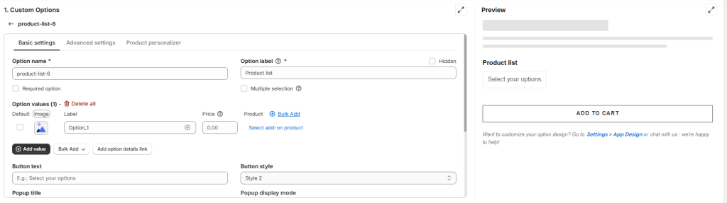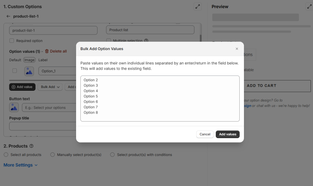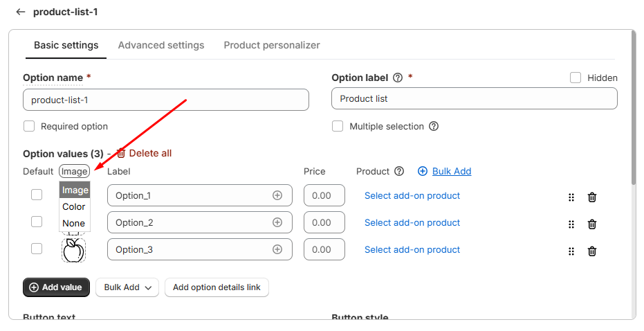 Option values: The option values section allows you to define the choices presented in the Product List option.