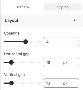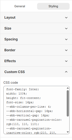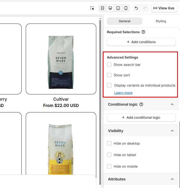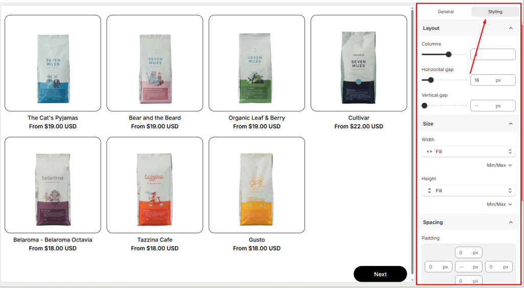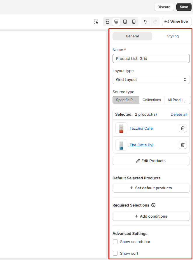 Use the Styling tab to control how your product list looks on the storefront.