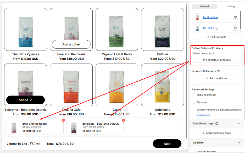 You can pre‑select certain products in the product list so they’re automatically added to the box from the start. This helps customers build their bundles faster, since some items are already included.