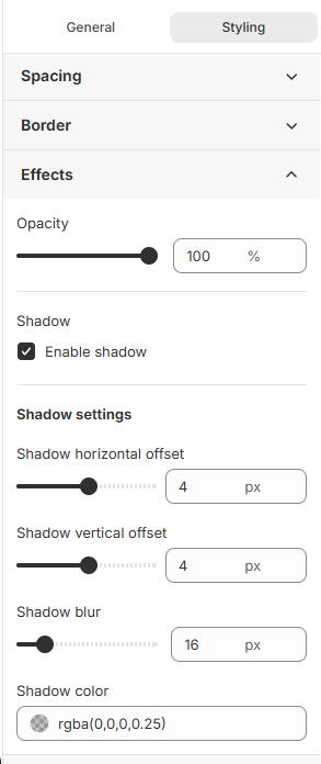 • Effects: Apply visual effects like opacity and shadows