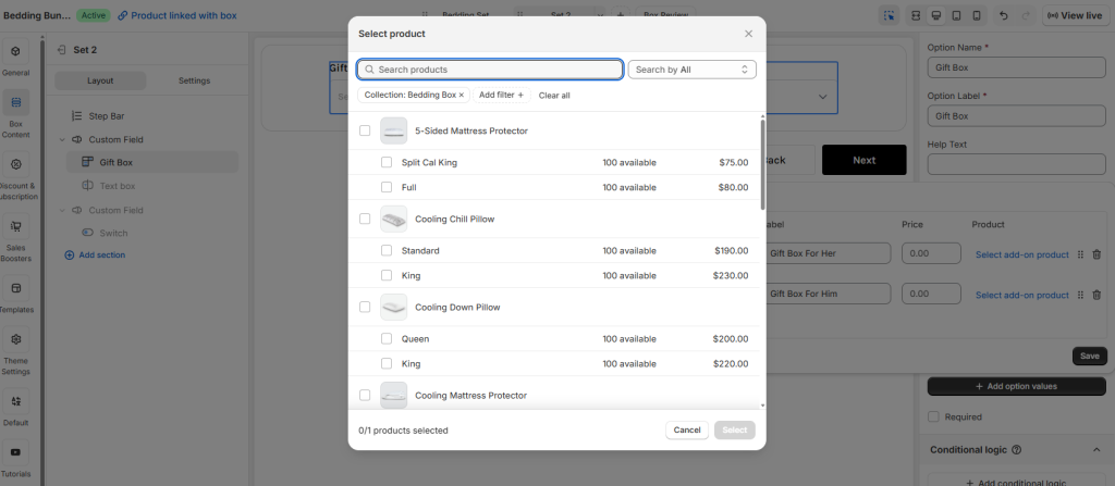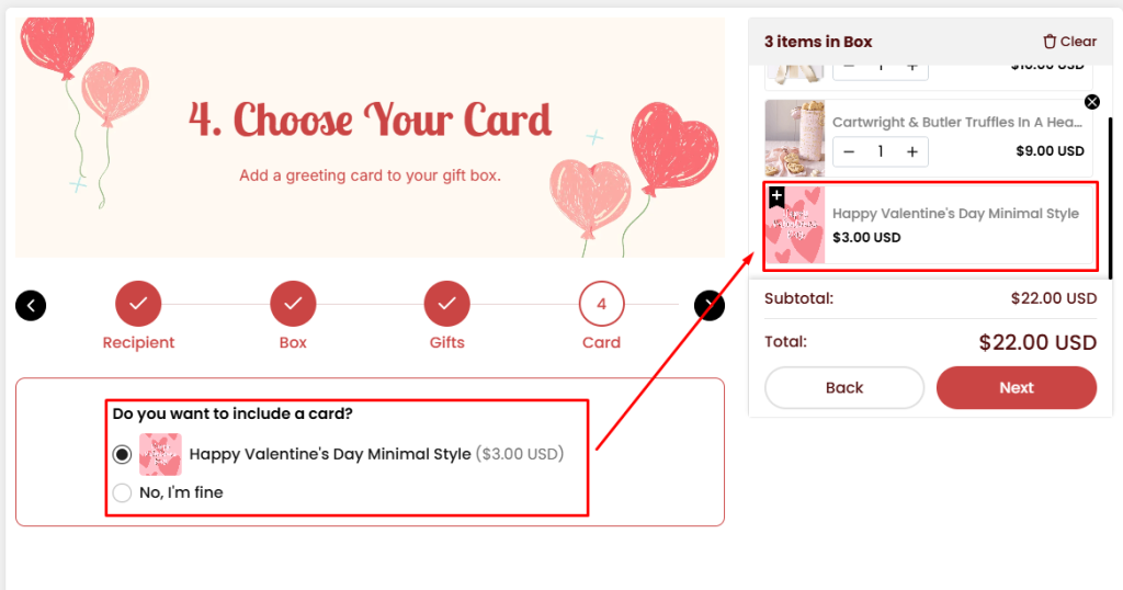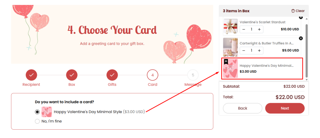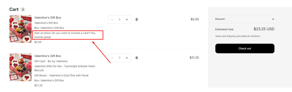 - Add‑on Products: A separate product automatically added to the box when a customer selects an option. It behaves like any other bundled product in the box. Example: Selecting “Add Greeting Card” adds a Greeting Card product variant to the box immediately