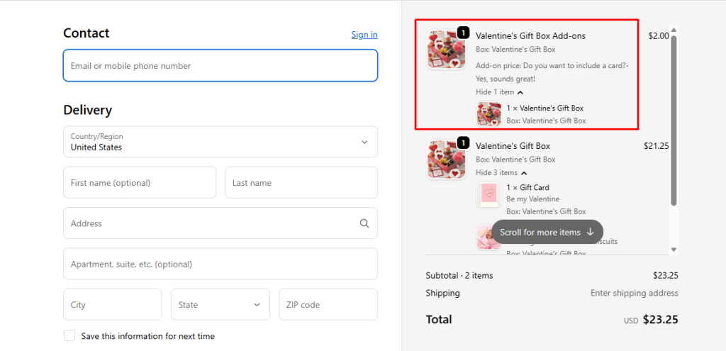 - In the Box Quick Summary, add‑on products are displayed with a small plus (+) icon so customers can easily distinguish them from the main box items.