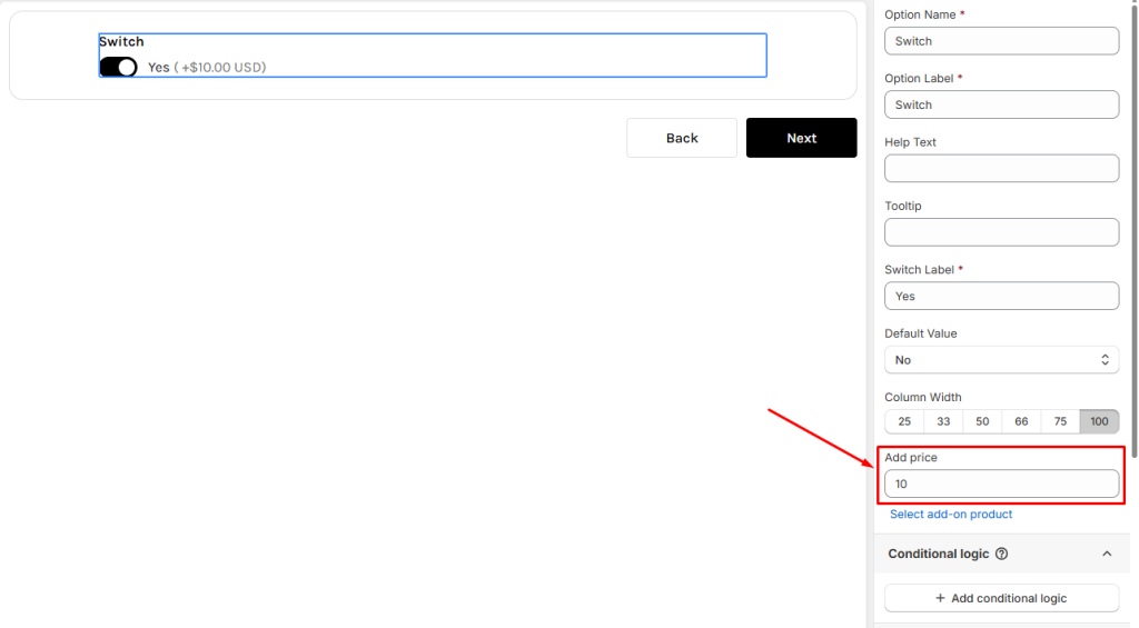Right next to the Add‑on Price input field, you’ll see the button “Select Add‑on Product.”