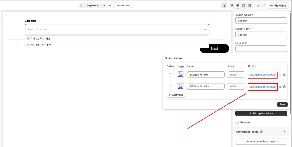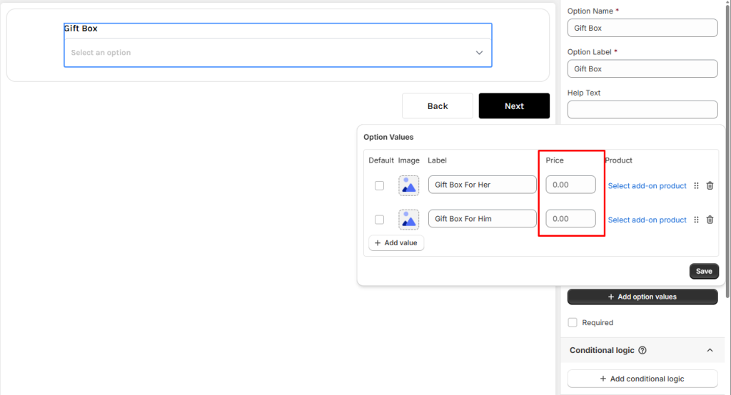 - Add‑on Price: An extra charge applied to the box when a customer selects a specific option. It doesn’t add a new product — just increases the box price. Example: Add “Engraving Text” adds $5 to the Bracelet Box total.