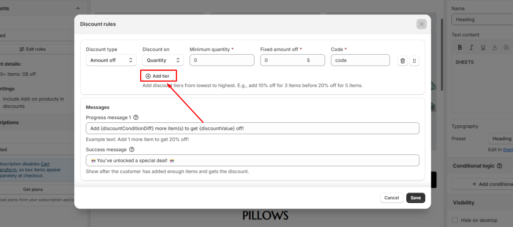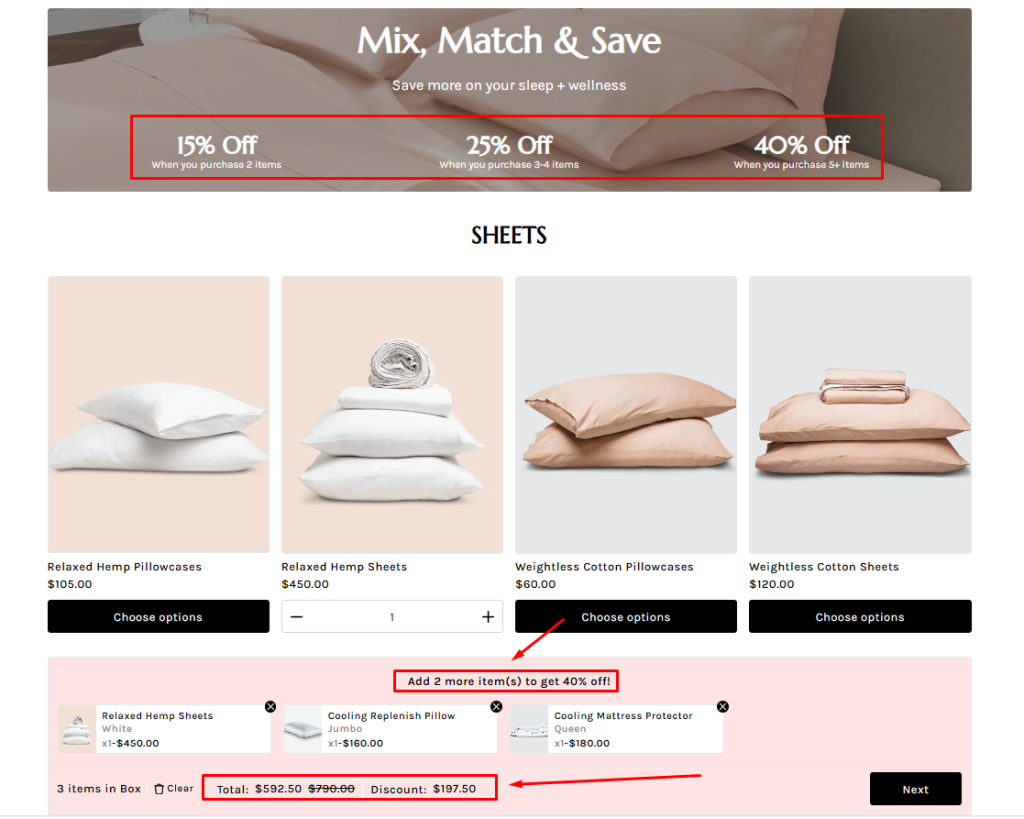 For example, you can set up tiered discounts for a Bedding Bundle like this: