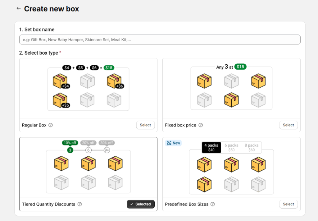 From the Easify Box Builder app admin, go to Box Management → Click the Create box button. Then:
