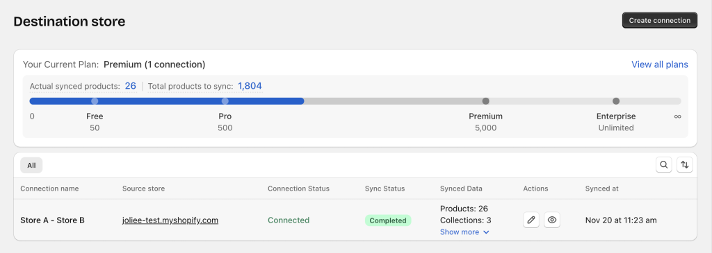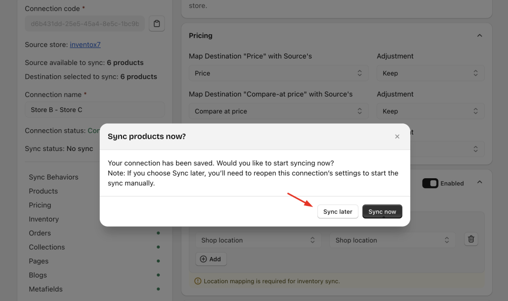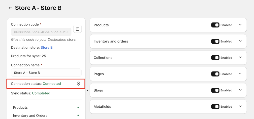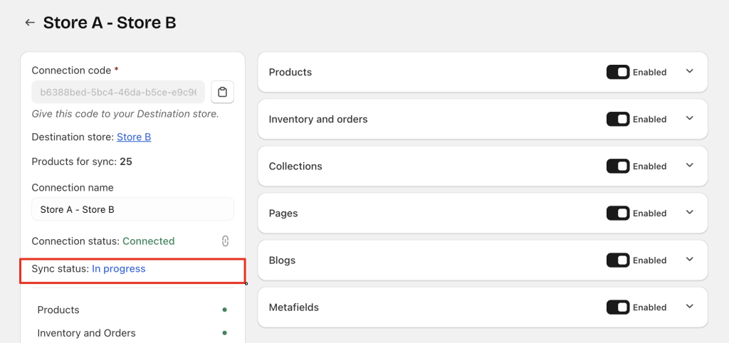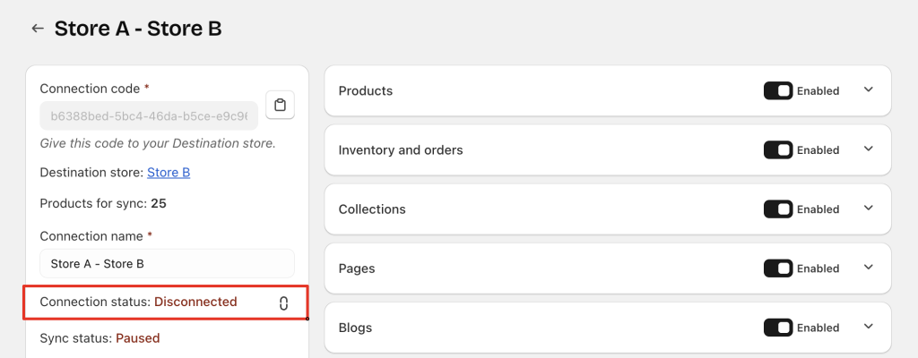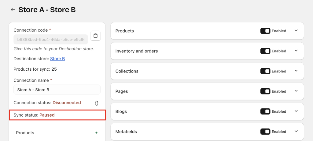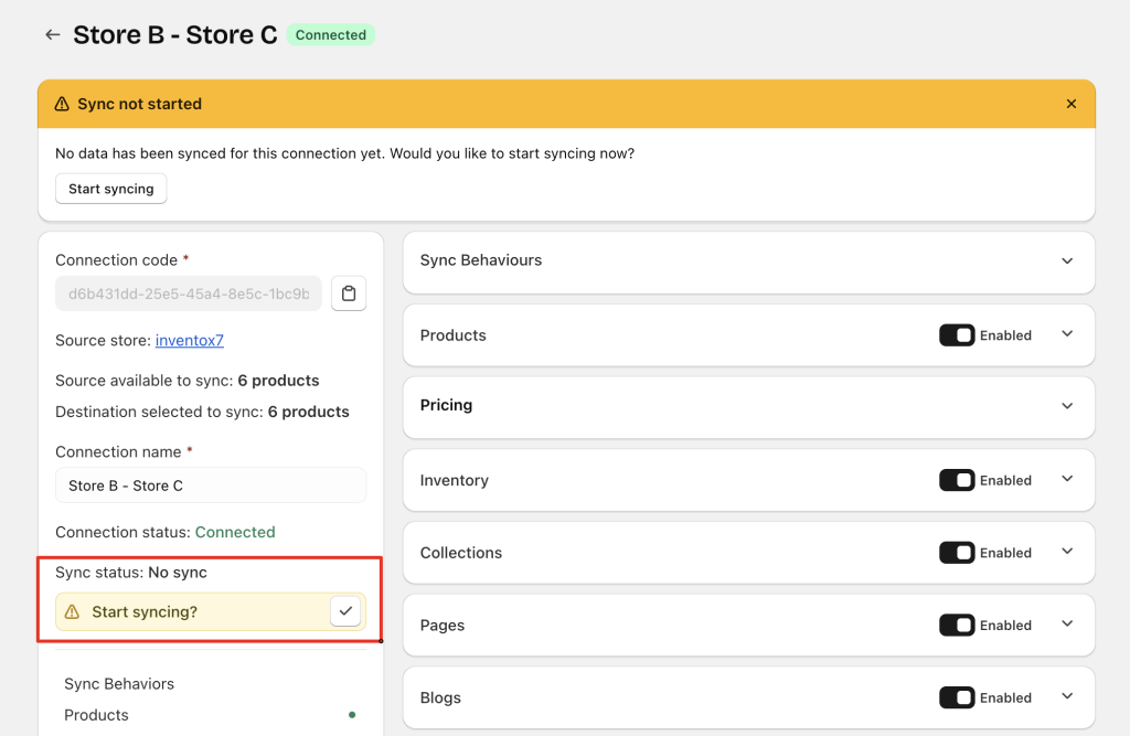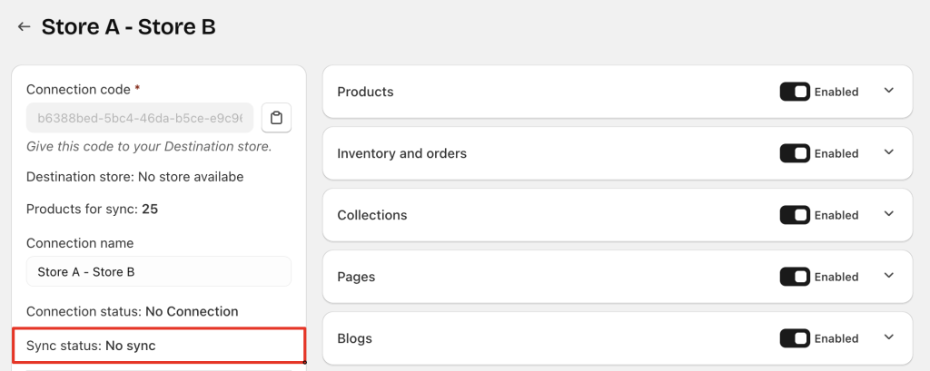 • The Destination store has not connected yet → Source store shows No Connection & No Sync
