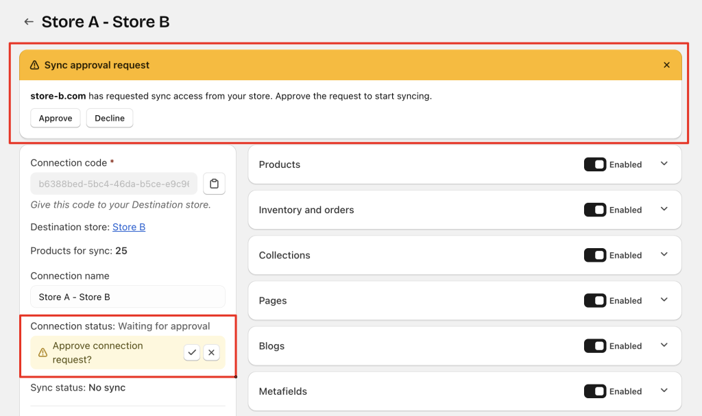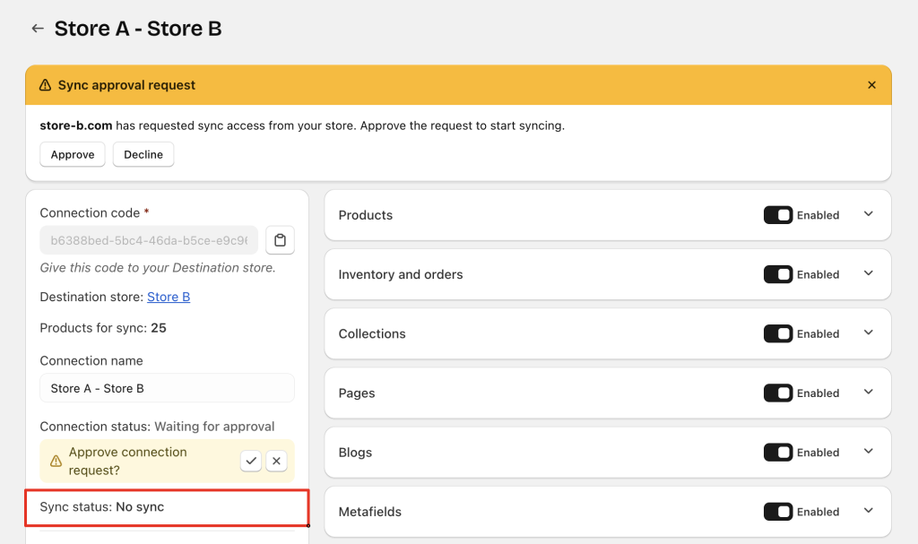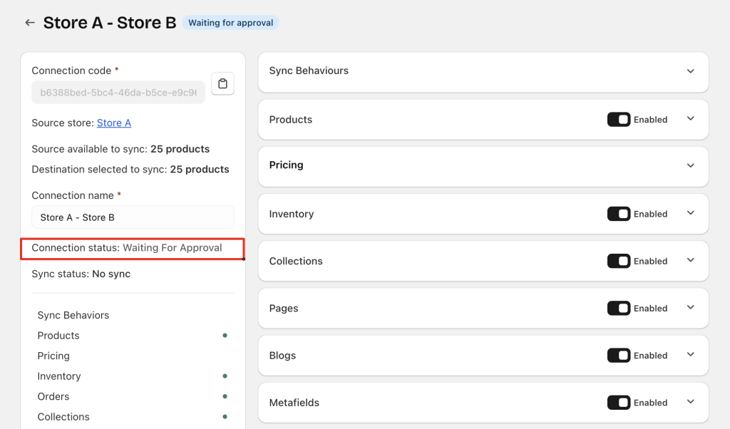 • The Destination store is still waiting for approval → both stores show Waiting for approval, and sync status is No Sync