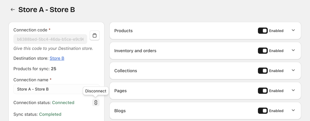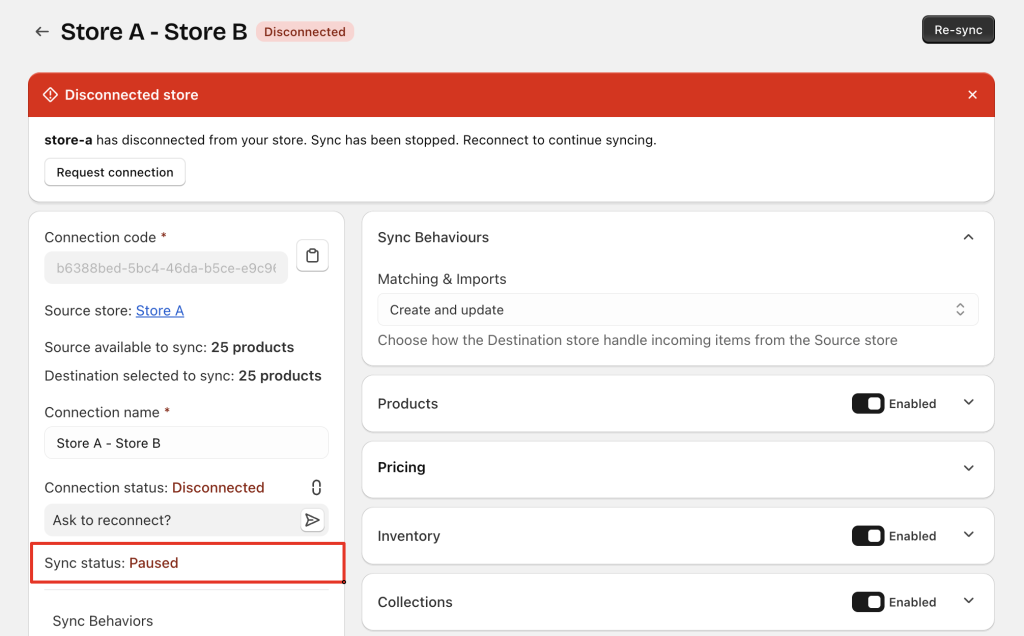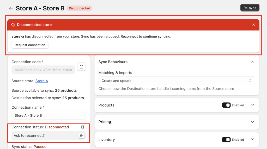 • Either store may send a reconnection request. Once approved, the connection returns to Connected