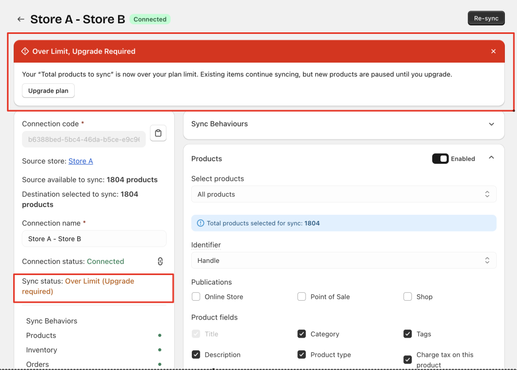 • If the plan limit is 50, syncing for all 100 items pauses until the store upgrades