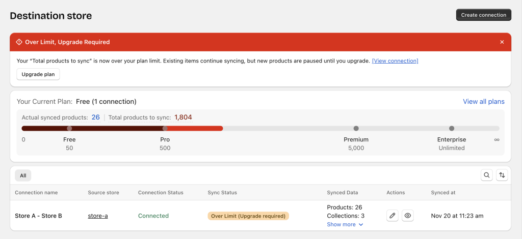 The Destination store’s plan does not support the number of products being synced.